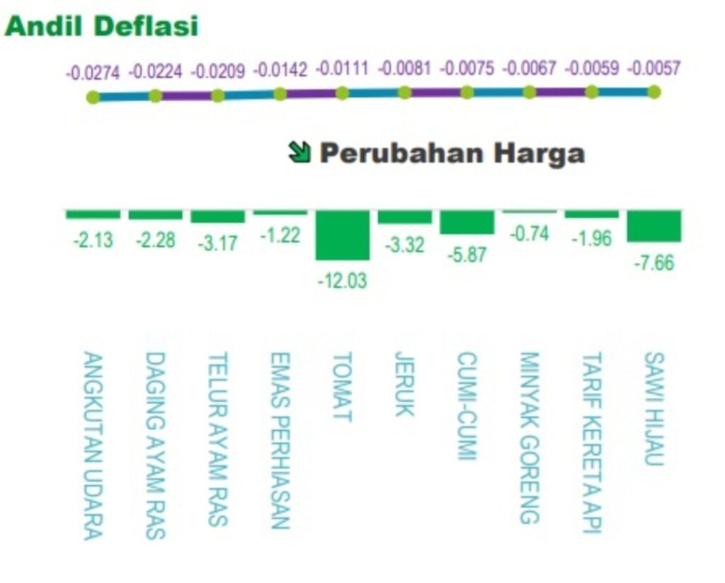 Minyak goreng juga turut menyumbang deflasi dengan persentase perubahan penurunan harga sebesar 0,74 persen dan andil 0,0067 persen, serta tarif kereta api dengan persentase perubahan penurunan harga sebesar 1,96 persen dan andil 0,0059 persen.