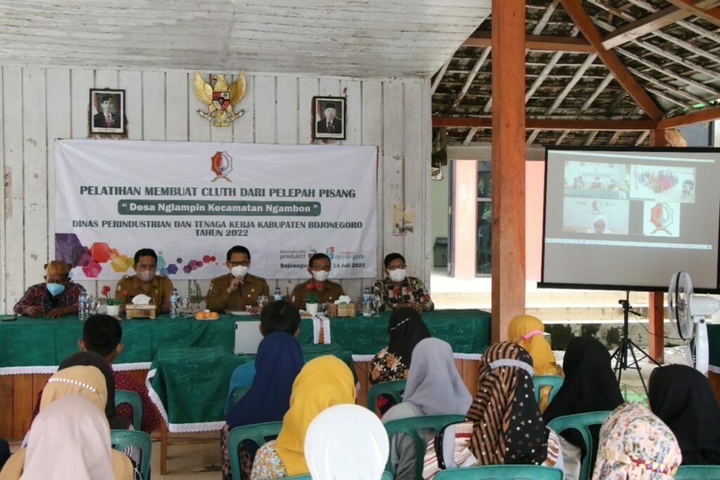 Merespons hal tersebut, Pemkab Bojonegoro melalui Dinas Perindustrian dan Tenaga Kerja Bojonegoro menggelar pelatihan kerajinan cluth pelepah pisang di Balai Desa Nglampin, Kecamatan Ngambon, Senin (11/07/2022) kemarin.