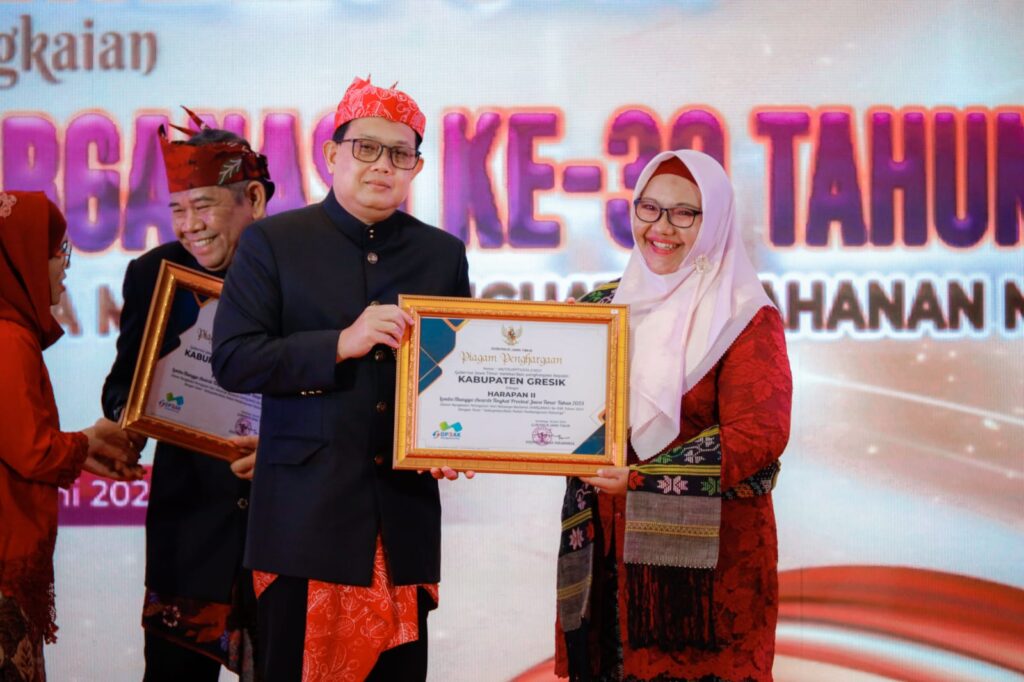 GRESIK, Berita Utama- Kabupaten Gresik mendapatkan juara harapan III penghargaan Indeks Pembangunan Keluarga (iBangga) Award Jawa Timur tahun 2023. Penghargaan tersebut diberikan oleh Gubernur Jawa Timur yang diwakili oleh Sekretaris Daerah Jawa Timur Adhy Karyono kepada Wakil Bupati Gresik Aminatun Habibah (Bu Min) saat pembukaan Kongres Perempuan, dalam rangkaian Hari Keluarga Nasional (Harganas) ke XXX, Senin (26/06/2023)