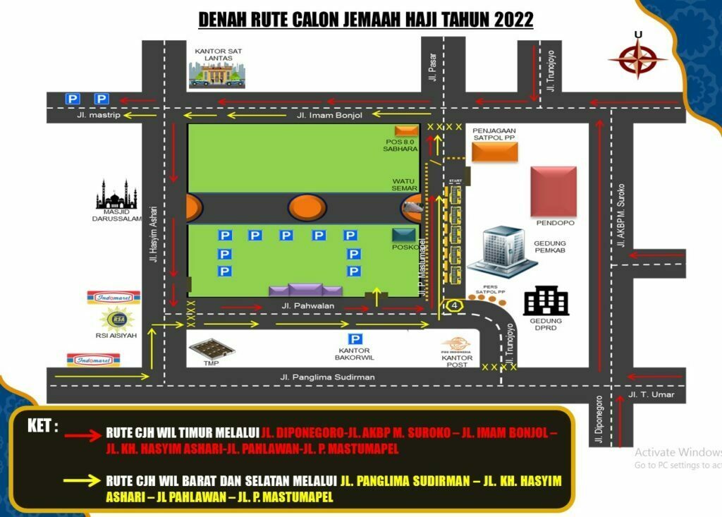 Tanda panah warna merah untuk CJH wil. timur melalui Jl. Diponegoro – Jl. AKBP M. Suroko – Jl. Imam Bonjol – Jl. KH. Hasyim As’ari – Jl. Pahlawan lalu masuk Jl. Mas Tumapel berhenti di pintu masuk pendopo. Selanjutnya mobil pengantar jalan lagi parkir di alun-alun maupun bakorwil.